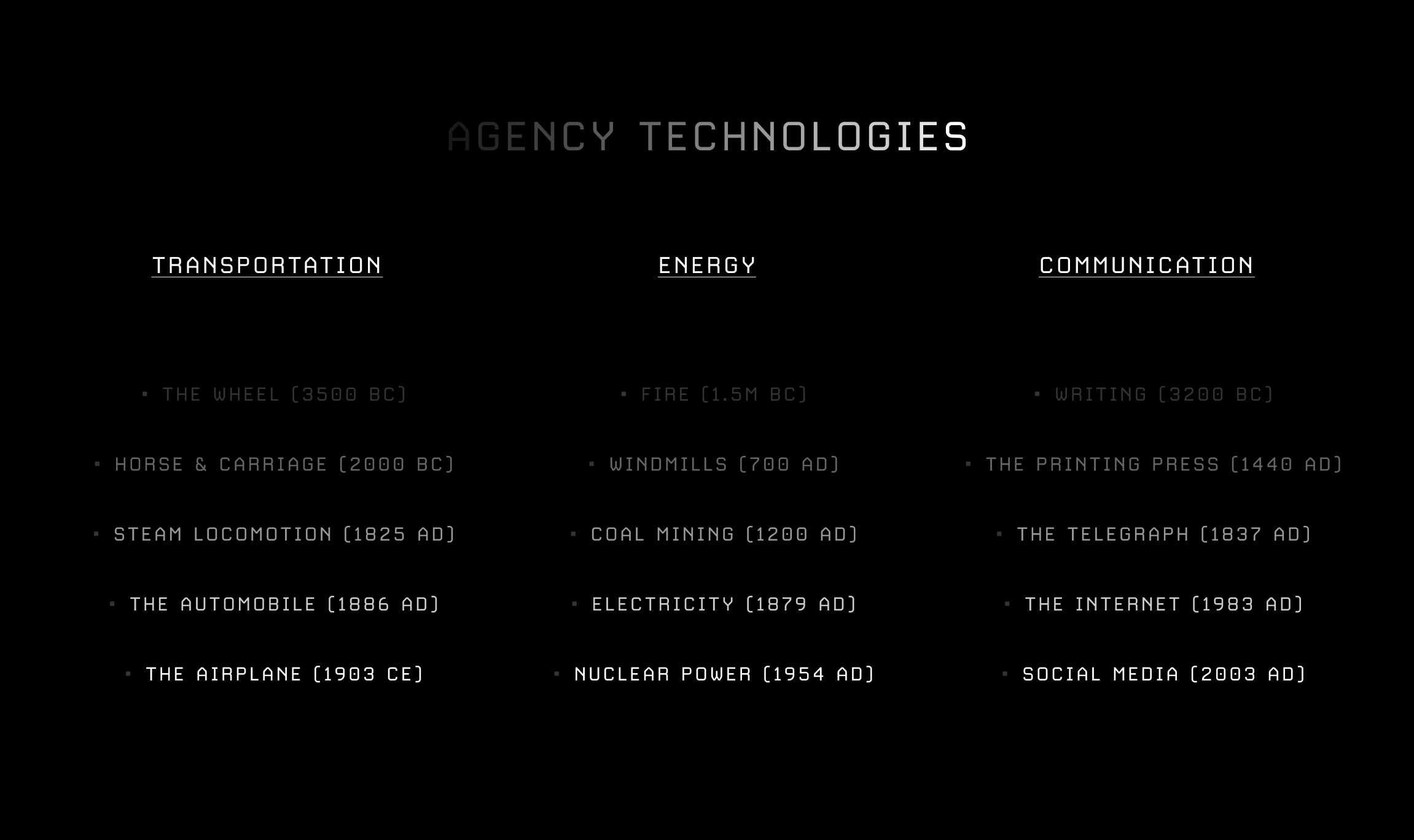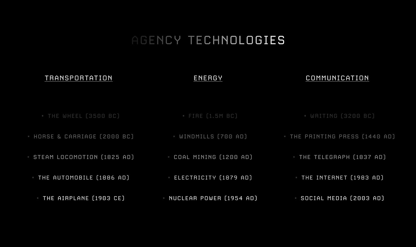 So in many ways, the story of agency and the story of innovation are but one and the same. To see this, lets consider some examples of invention throughout history across three different buckets - transportation, energy, and communication: